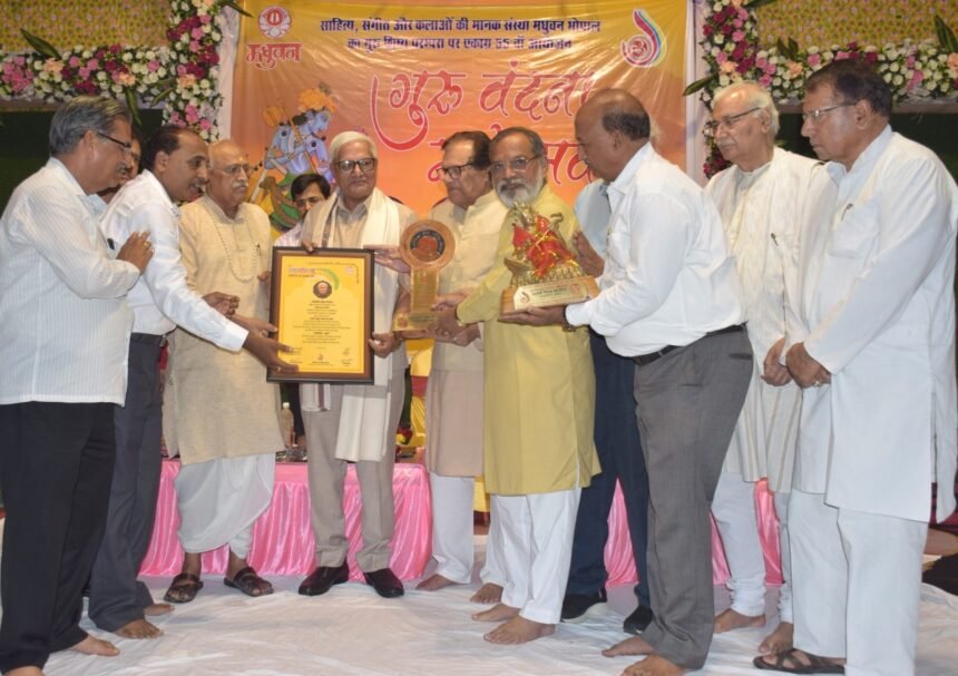मानस भवन के सभागार में आयोजित अभिनव कला परिषद एवं मधुवन के 55वें गुरु वंदना महोत्सव में अतिथियों ने देश के पद्मश्री अलंकृत श्री विजय दत्त श्रीधर को पत्रकारिता भूषण की मानद उपाधि , शीर्ष कला मनीषी श्री रमेश बोराणा – जोधपुर, डाॅ. हरिमोहन बुधौलिया – उज्जैन, डाॅ. राम वल्लभ आचार्य – भोपाल, पं. उमेश भट – उज्जैन एवं श्री गोपाल चन्द्र गुप्ता – नरसिंहगढ़ को *श्रेष्ठ कला आचार्य तथा पं. कमल कामले, पं. अनिल पौराणिक को अभिनव संगीत रत्न तथा श्री देवेन्द्र सक्सेना श्री बद्र वास्ती, शोएब खान एवं श्रीमती प्रीति राठौर को अभिनव कला सम्मान प्रदान कर सम्मानित किया । इस अवसर पर कीर्ति सूद ने भजन एवं पं. कमल कामले ने वायलिन वादन की प्रस्तुति दी । तबले पर साथ रामेन्द्र सिंह सोलंकी ने संगति दी ।